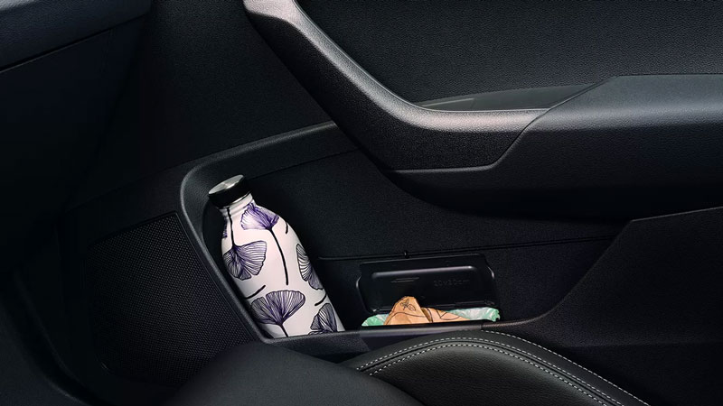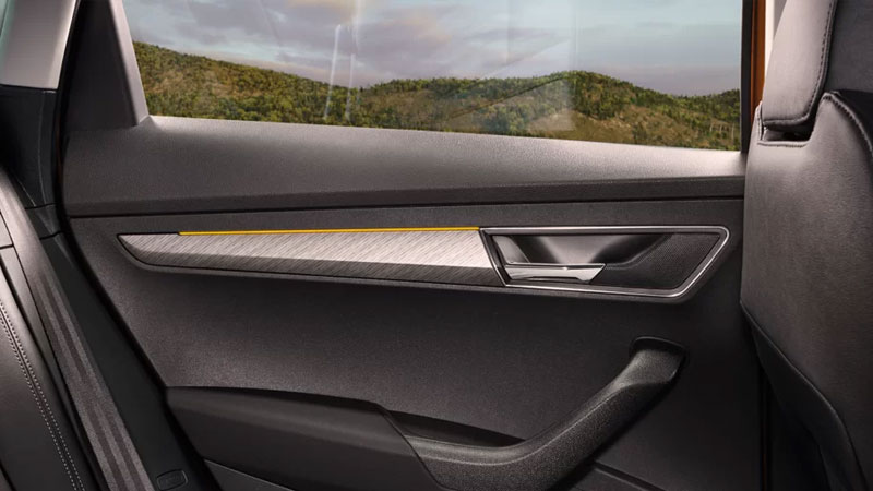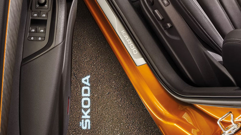 Phần cánh cửa tích hợp các nút bấm tiện ích và đèn chào đón bạn với dòng chữ Skoda
